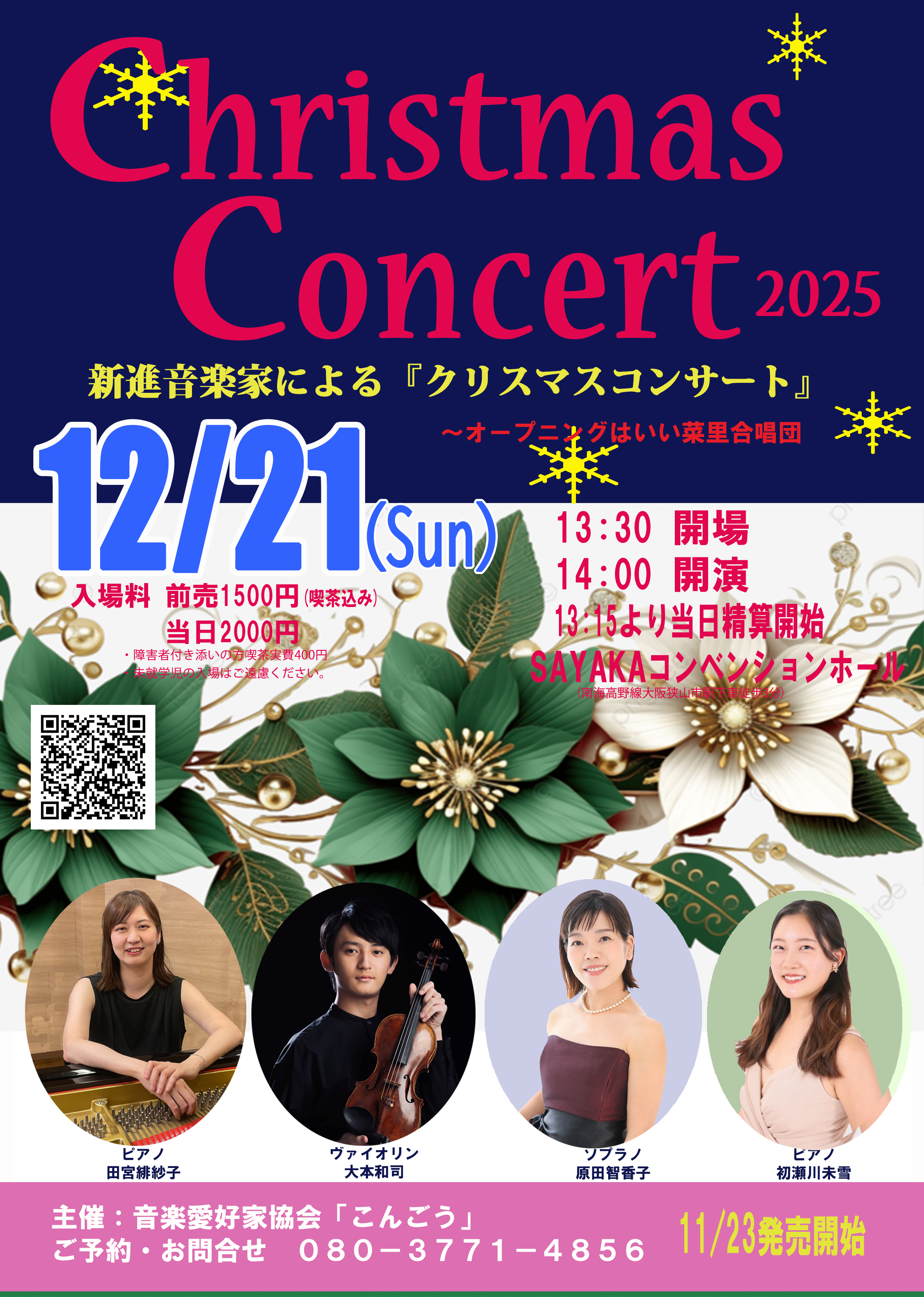 新進音楽家によるクリスマスコンサート12月21日(日)開場13:00 開演14:00 会場:SAYAKAホール・コンベンションホール 前売:1,500円(当日500円UP) ※障がい者付添の方喫茶実費400円 ......more