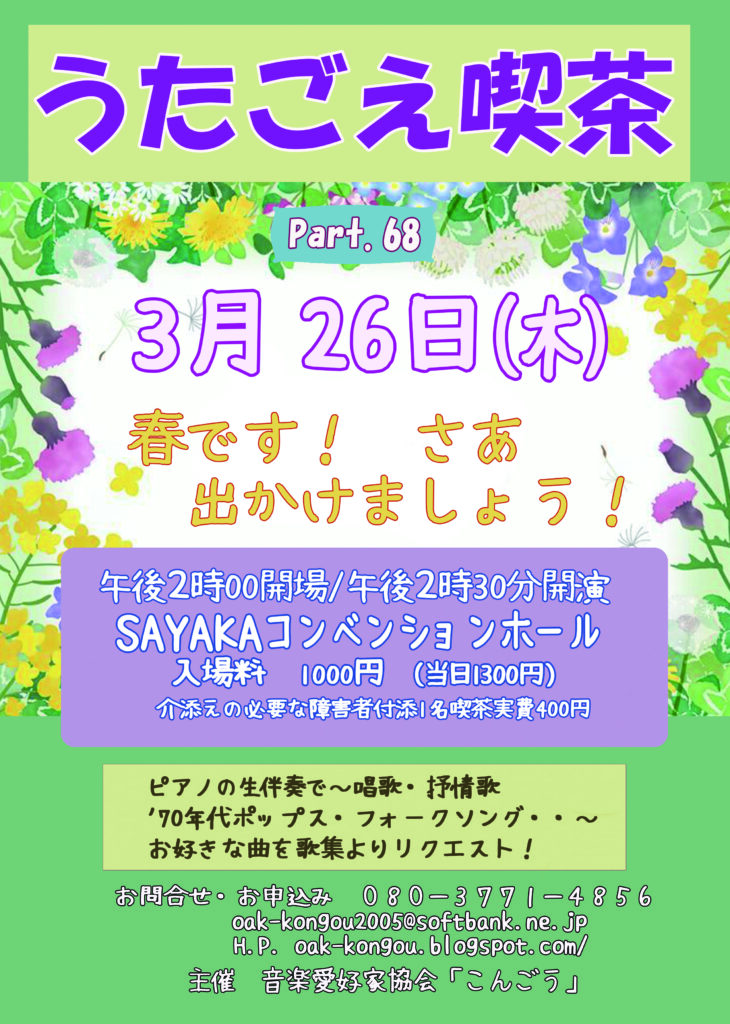 3月26日(木) 開場:14:00 開演14:30 会場:SAYAKAホール・コンベンションホール 入場料:1,000円(当日300円増) ※介添えの必要な障害者付添1名喫茶実費400円