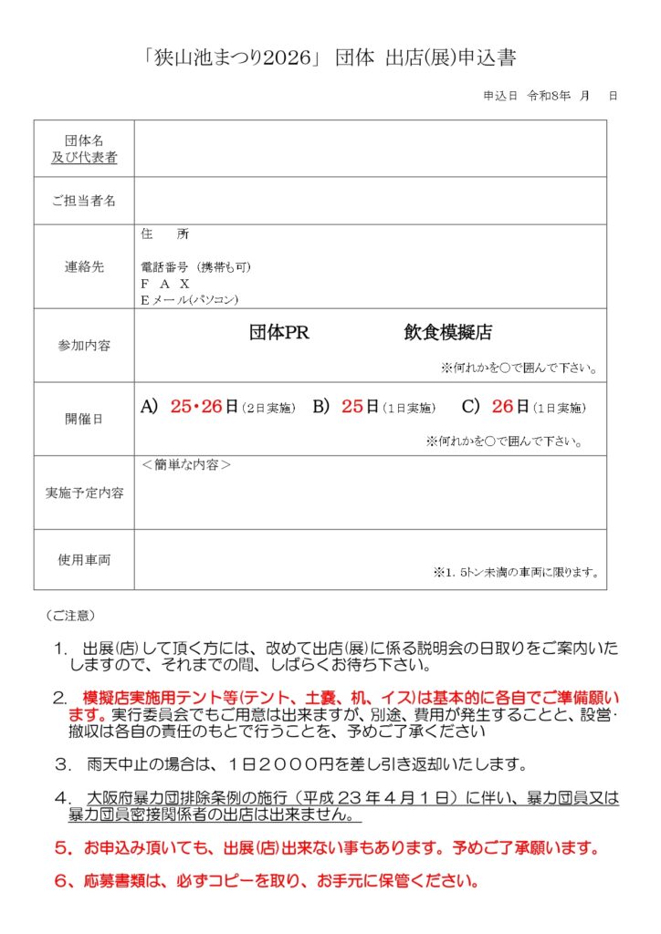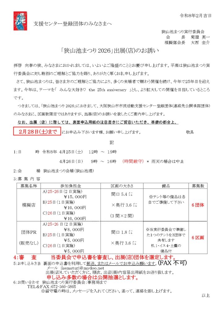 4月25日(土) 12:00~19:00、4月26日(日)9:00~16:00 ※時間厳守 会場:狭山池まつり会場(狭山池堤)